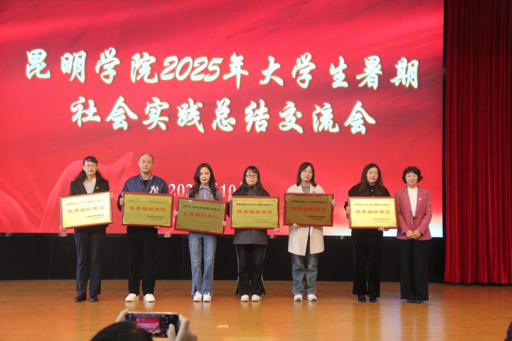 会上,校团委副书记郎易宣读了昆明学院2025年大学生暑期社会实践工作优秀集体和个人名单,与会领导为获奖代表颁奖。数学学院尹利方老师代表优秀组织单位进行了交流发言;“语润凤山,言泽乡音”和“云岭童尘”两个“三下乡”社会实践团代表分别作了优秀团队分享展示。